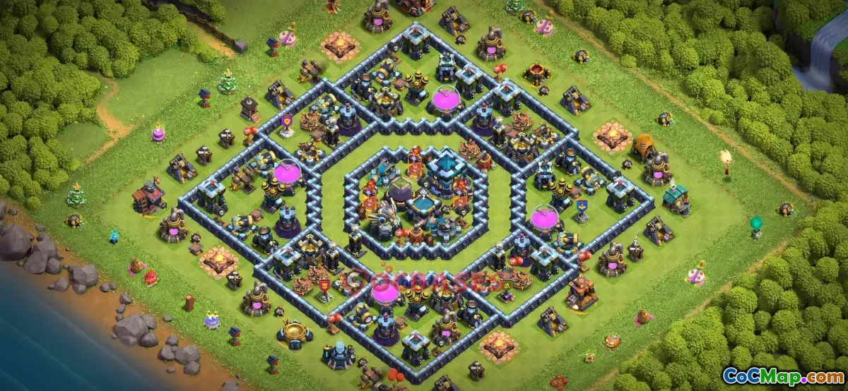 One of the key features of a good Town Hall 13 farming base is the strategic placement of walls, defenses, and traps. Defensive structures like the Archer Towers, Cannons, Wizard Towers, and the Eagle Artillery are positioned to cover as much area as possible, ensuring that attackers face a comprehensive defense when attempting raids. By placing resource storages in protected compartments with defensive support, players can maximize their resource protection while still maintaining farmability, which is crucial for ongoing upgrades and progress.