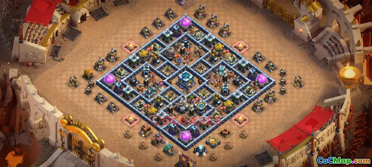 One of the key features of a Town Hall 13 hybrid base is its versatility, allowing players to defend against both attacking styles: farming and war. Hybrid bases incorporate elements of both farming bases (focused on protecting resources) and war bases (focused on safeguarding the Town Hall and offensive buildings). This design often includes well-placed key defenses such as the Eagle Artillery, Inferno Towers, and Clan Castle, which are critical for defending against high-level attacks.