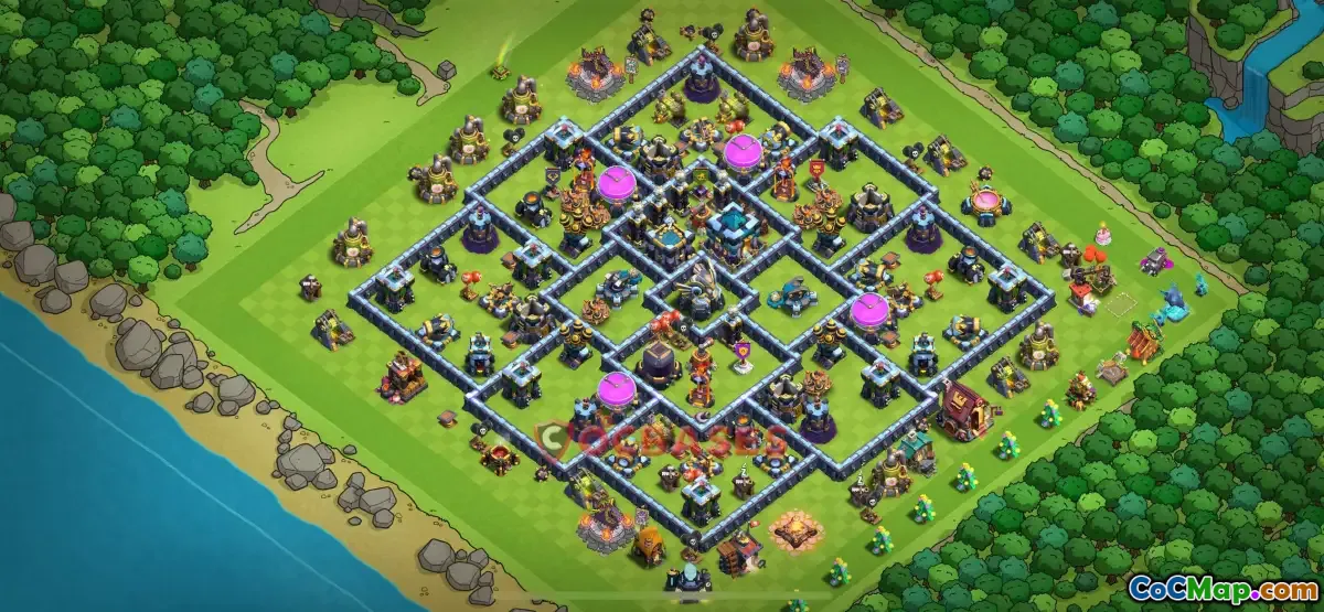 Discover the best Town Hall 13 hybrid base design in Clash of Clans. Optimized for defense and offense. Copy the base link now!