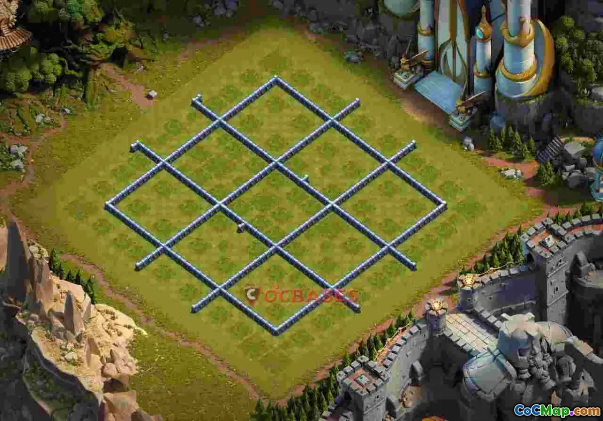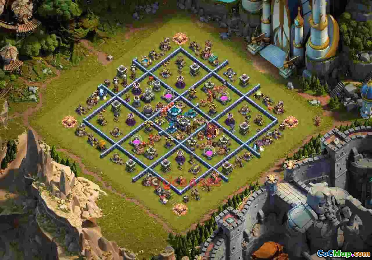 This Town Hall 13 progress base with layout ID 4ehqc offers robust protection for your resources and Town Hall, making it a versatile choice for players focusing on war, farming, or trophy gains. Its asymmetric design enhances difficulty for attackers, especially against electro dragons and common 3-star strategies, by decentralizing key defenses and traps.