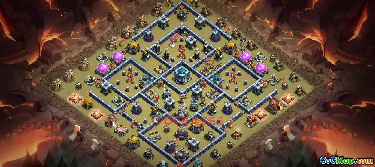 The Town Hall 13 war base layout is optimized to protect your resources and defenses in Clan wars. Its strategic placement of key defenses like the Eagle Artillery, Inferno Towers, and Queen Tower creates a robust barrier against enemy attacks. The design encourages attackers to deploy spells and troops thoughtfully, making it harder to achieve a three-star victory.