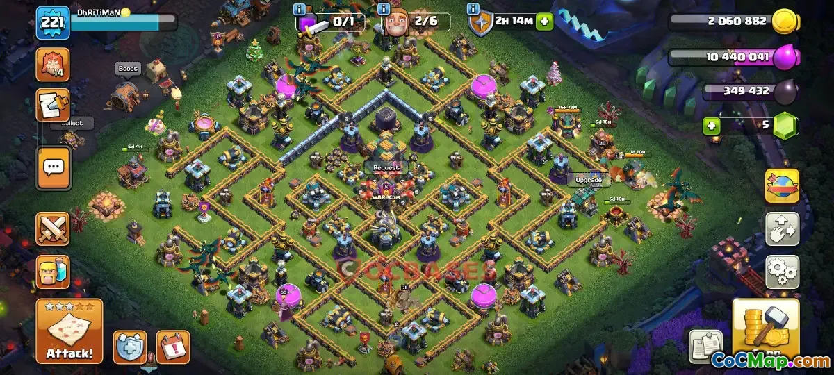 This Town Hall 14 farming base is expertly designed to prioritize resource protection, making it ideal for players aiming to maximize loot during farming sessions. The layout places storages centrally, surrounded by well-placed defenses to deter raiders and minimize resource loss. Its symmetrical design ensures balanced protection and ease of deployment.