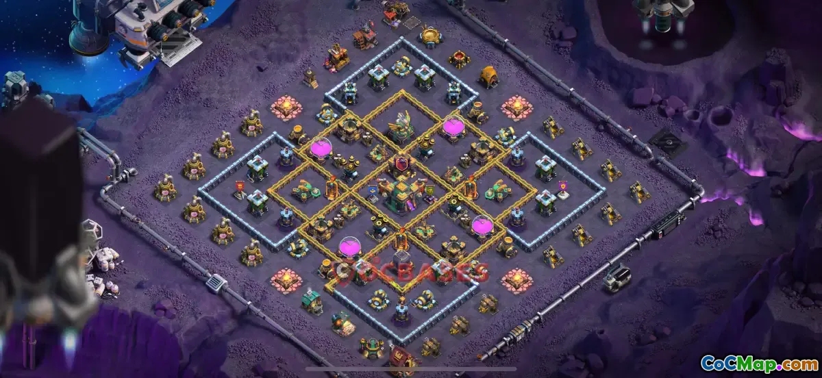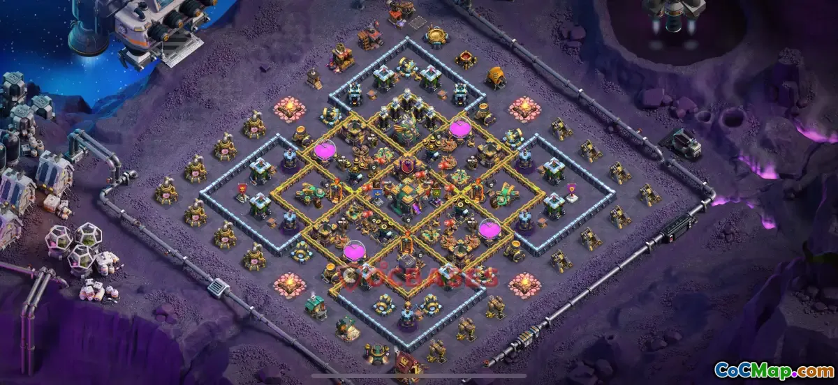This Town Hall 14 hybrid base design is specifically crafted for Clash of Clans players seeking a versatile layout that accommodates both trophy pushing and farming strategies. It combines defensive structures strategically placed to protect resources and trophies simultaneously, making it suitable for players who want to maintain a balance between defending their resources and climbing the ranks.