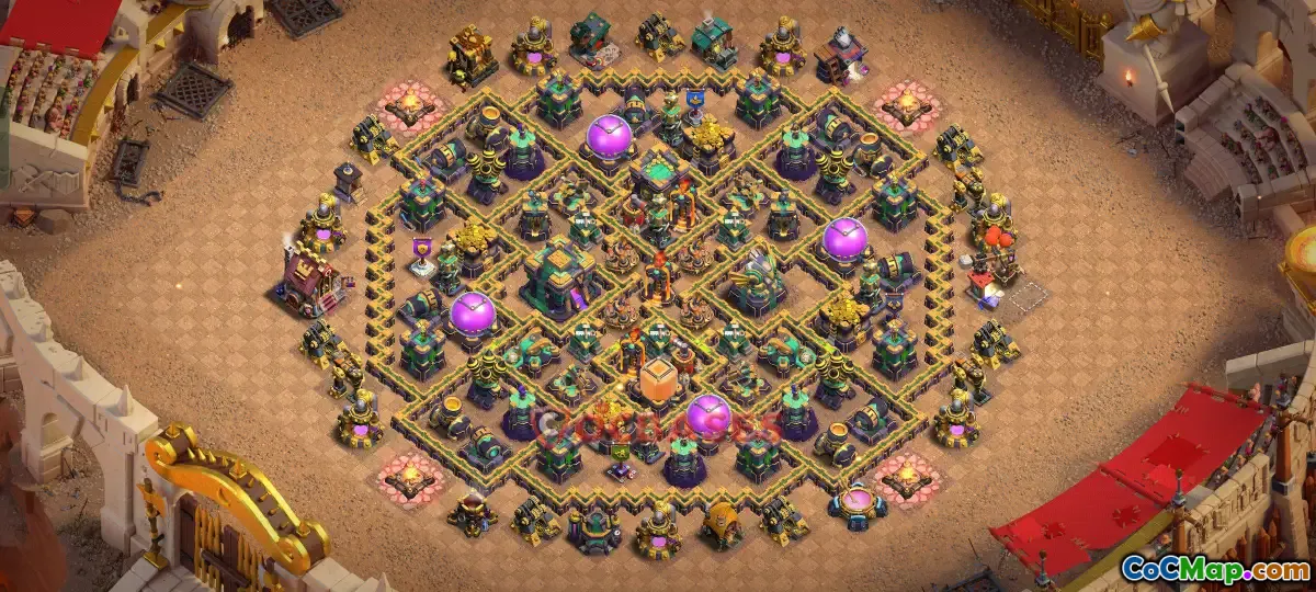 This Town Hall 14 hybrid base is designed to provide optimal protection for both offensive raids and resource security. It combines strong defensive placements with strategic clan castle and trap positioning to maximize durability against various attack strategies.