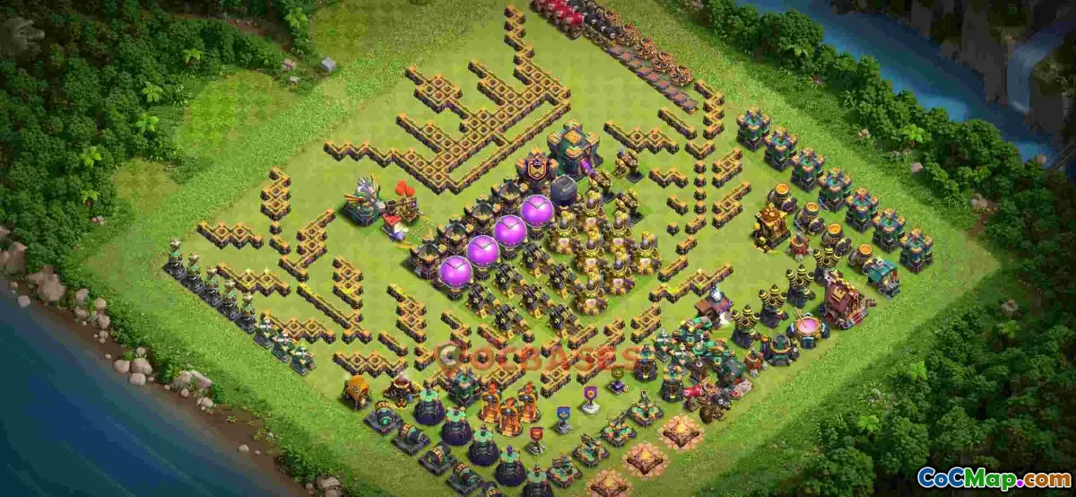 The base features a well-placed core with key defensive structures and strategic compartmentalization to hinder enemy attacks. Its layout encourages attackers to focus on specific entry points, enhancing the defensive potential. Whether you're focusing on war defense, trophy climbing, or farming efficiency, this layout provides a solid foundation for your TH14 development. A copy link is provided so players can easily implement and customize the design to suit their gameplay style and clan requirements.