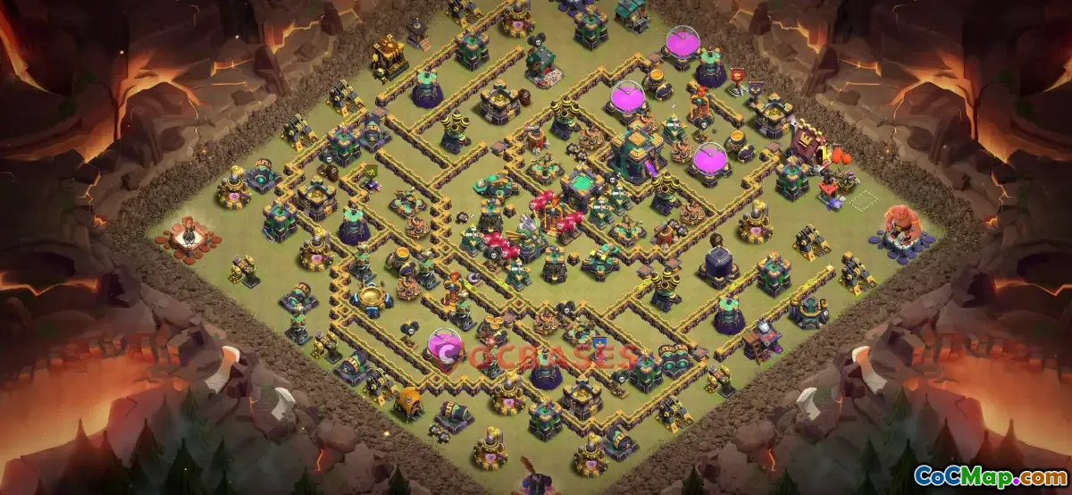 Discover an effective Town Hall 14 war base layout optimized for clan wars, with a strong central core and well-placed defenses to protect vital resources and critical structures. This design helps deter attackers and encourages strategic troop deployment.