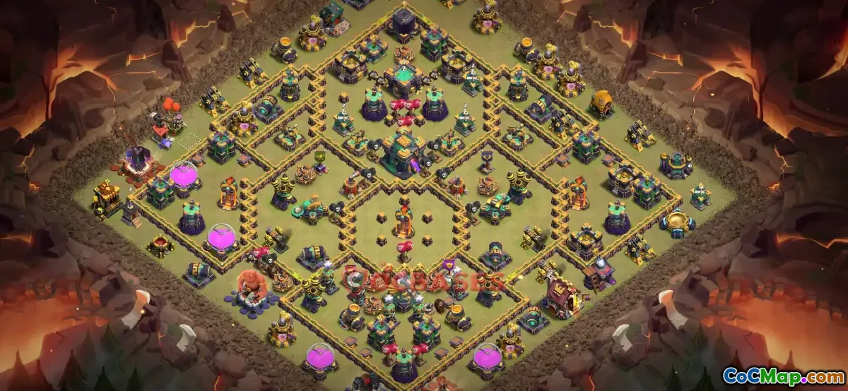 This Town Hall 14 war base is optimized to protect your resources and defend against enemy attacks effectively. Its strategic placement of defenses, traps, and Clan Castle ensures a balanced approach to defense, making it difficult for attackers to penetrate your core. The layout emphasizes centralizing key defenses while maintaining layered walls to slow down enemy troops, enhancing overall survivability during clan wars.