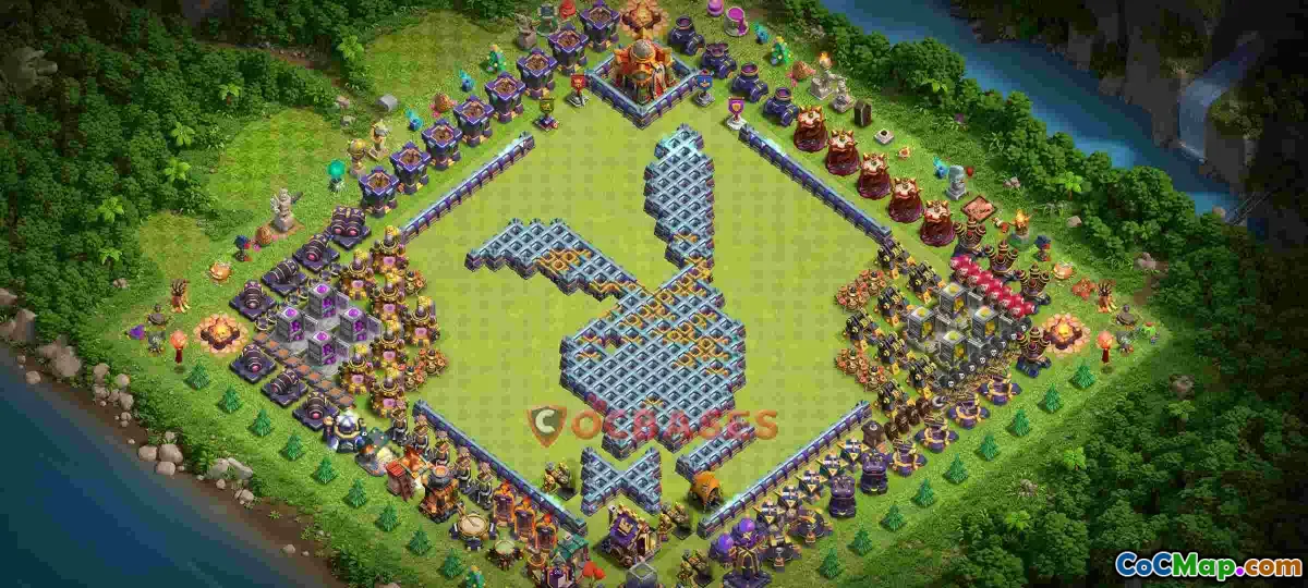 Designed specifically for TH16, this layout balances defensive buildings and trap placements to maximize protection against different attack strategies. It is easy to copy with a provided link, allowing players to quickly implement an effective base that prioritizes defense while maintaining an attractive and unconventional appearance. Perfect for Clans looking to challenge opponents with a creative, effective layout across multiple game modes.