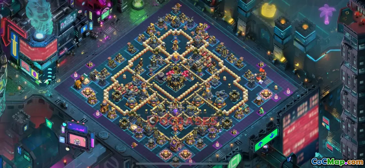 This base layout often includes a mix of splash damage defenses like the Poison and Rage Clan Castles (CC) to counter various attack strategies. The Poison CC can contain two Inferno Guards (IG) and one Archer, while the Rage CC may have seven Archers or three Inferno Guards with ten Archers. These combinations are designed to maximize damage output and survivability during attacks, preventing enemies from easily destroying key defenses and trophies.