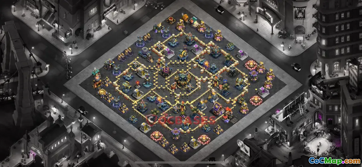 The Town Hall 17 war base in Clash of Clans is designed to maximize defense and protect your resources during clan wars. It features strategic placement of defensive buildings such as cannons, archer towers, and air defenses to cover key areas of the base. The layout typically emphasizes a well-structured core with protected storages and defensive structures, making it difficult for attackers to reach the center and cause significant damage.