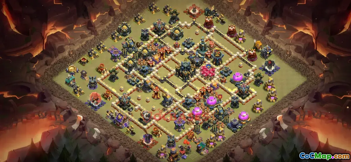 The Town Hall 17 war base in Clash of Clans is a strategic layout designed to defend against enemy attacks during clan wars. It incorporates various defensive structures such as cannons, archer towers, inferno towers, and air defenses, all positioned thoughtfully to maximize protection. The goal of this base design is to create a balanced layout that can withstand different types of attack strategies, whether ground or air assaults, ensuring the clan’s victory in war scenarios.