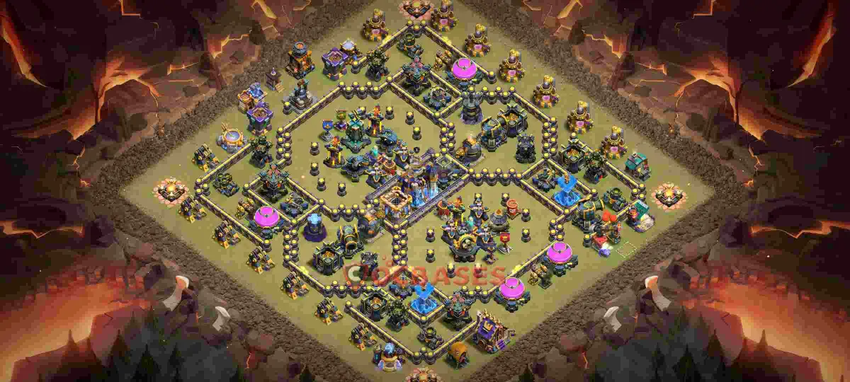 Effective TH18 farming layout with strong anti-3 star, anti-air, and anti-ground defenses, optimized for war, farming, and trophies. Copy the base design now!