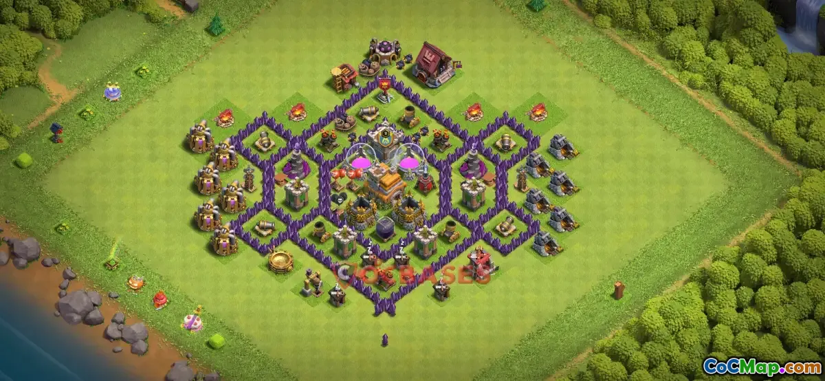 This Town Hall 7 farming base is designed specifically to maximize resource protection while allowing players to efficiently gather loot in Clash of Clans. The layout focuses on creating a strong defensive perimeter with strategically placed walls and defenses to slow down and weaken attack forces. By emphasizing resource storage placement within protected compartments, players can minimize resource loss during raids, making it ideal for farming purposes.