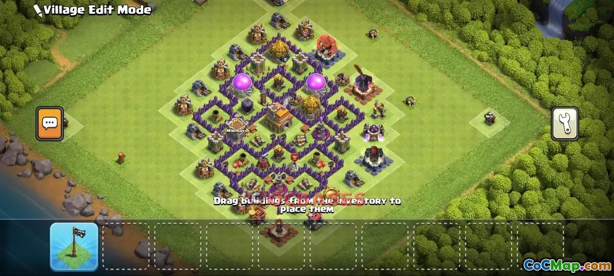 The base design includes strategic placement of defenses to create a strong barrier against attacks. By incorporating the right positioning of walls, traps, and defensive buildings, it enhances your overall protection, making it difficult for enemies to penetrate your defenses or reach your storages and town hall easily. This setup is optimized to withstand attacks common at Town Hall 7 level.