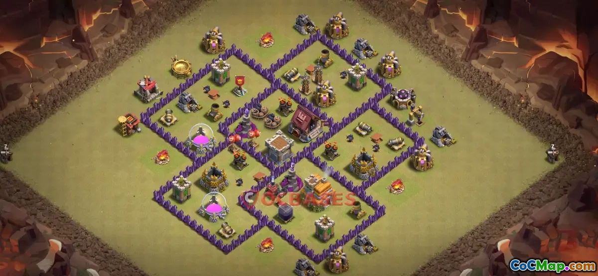 The Town Hall 7 war base in Clash of Clans is a strategic layout designed to protect your resources and defend against enemy attacks in clan wars. It typically features carefully arranged walls and defensive structures such as cannons, archer towers, and air defenses to create a strong fortress. The goal of this base design is to minimize the damage from opponents and increase your chances of winning war defenses.