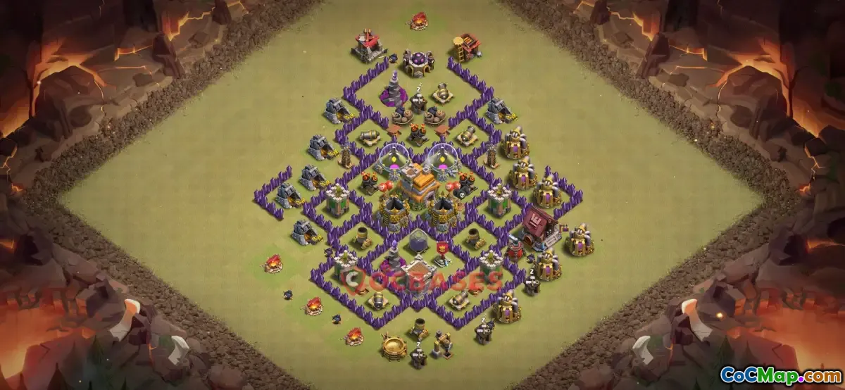 The Town Hall 7 war base in Clash of Clans is designed to balance defense and resource protection. At this level, players focus on setting up their base layout to defend against invading clans during wars. The base typically includes well-placed walls, defensive structures such as cannons, archer towers, and mortars, and strategically positioned traps to thwart enemy troops. Properly organizing these elements can significantly improve the chances of winning defensive battles in Clan Wars.
