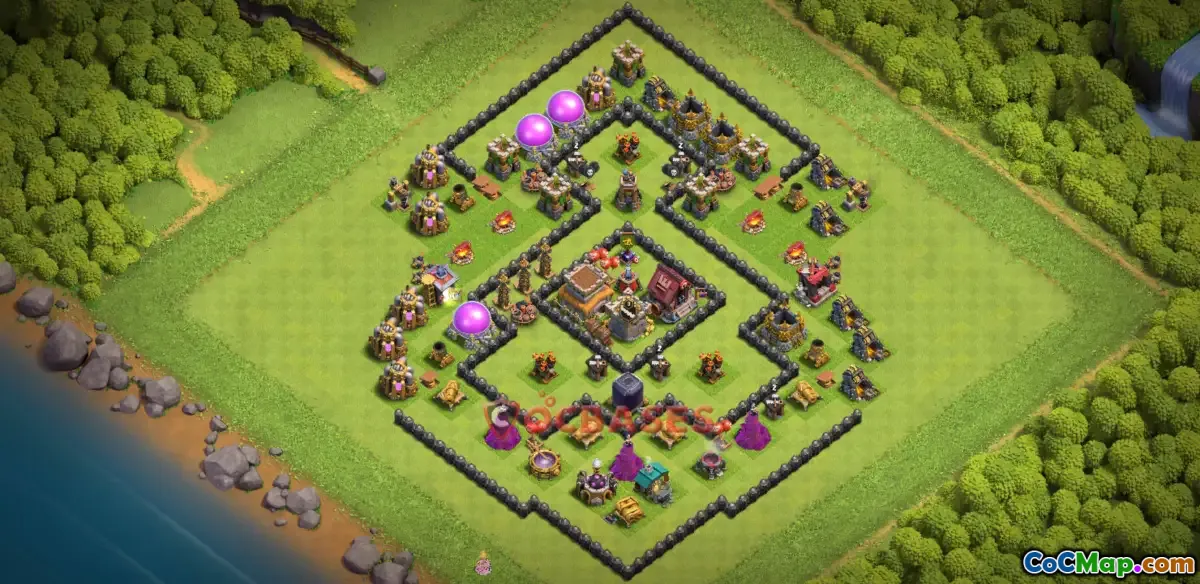 Using a hybrid base at Town Hall 8, players can safeguard their gold, elixir, and dark elixir storages while maintaining a strong defense around the core of the base. Key features include strategically placed traps, well-positioned cannons, archer towers, and walls that work together to deter and weaken attackers. The layout often features centralized defenses and well-distributed resource collectors, ensuring that attackers cannot easily loot resources and destroy the Town Hall in a single attack, thus earning higher defense success rates.