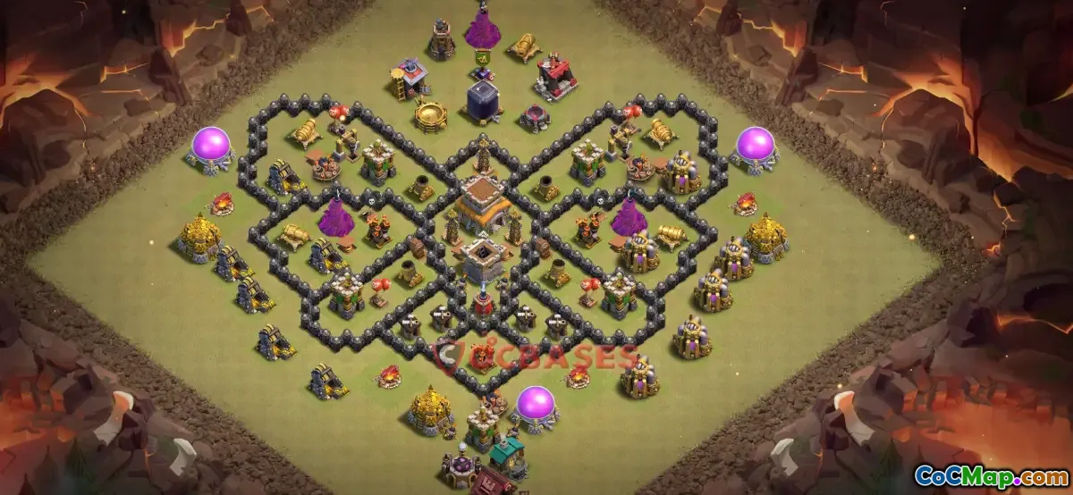 The Town Hall 8 war base in Clash of Clans is designed with strategic defensive placements to protect resources and prevent enemies from gaining easy stars during war attacks. This base layout often includes centralized storages and carefully positioned defenses to create a strong barrier against attackers. Popular features of a good Town Hall 8 war base include well-placed Cannons, Archer Towers, and Wizard Towers that cover key areas, as well as walls arranged to slow down attacking troops and compartmentalize the base for better defense.