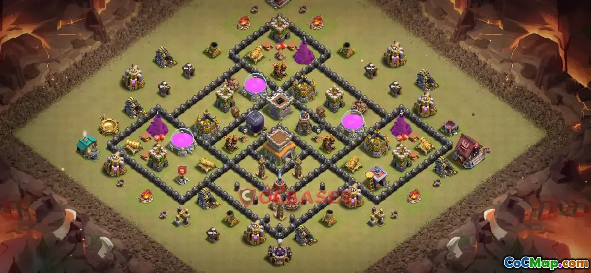 The Town Hall 8 war base in Clash of Clans is a strategic layout designed to defend against enemy attacks while maximizing the potential for winning wars. This base setup typically emphasizes strong defenses, such as well-placed walls, defensive structures like cannons, archer towers, and mortars, as well as traps that target enemy troops. The goal is to create a balanced defense that can withstand various attack strategies used by opponents in clan wars.