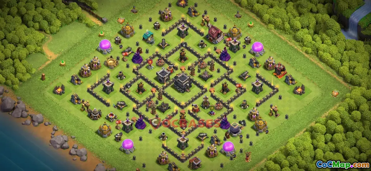 In Clash of Clans, a Town Hall 9 farming base is designed specifically to efficiently gather resources while providing adequate defense against attacks. This type of base layout focuses on protecting gold and elixir storages, which are crucial for progressing in the game. The design usually involves strategic placement of defenses such as Archer Towers, Cannons, and Wizard Towers to create a strong defensive perimeter around key resource buildings, making it harder for opponents to raid successfully.