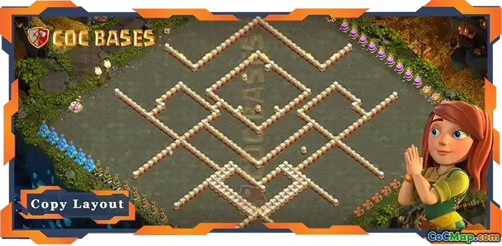 De basis wordt gekenmerkt door een zigzagpatroon van muren, dat dient om vijandelijke troepen te vertragen en om te leiden. Door de muren op deze manier te ontwerpen, kunnen spelers een natuurlijke barrière creëren die het voor aanvallers moeilijk maakt om snel de verdediging binnen te dringen. Door het stadhuis naast het centrale compartiment te plaatsen, wordt een extra beschermingslaag toegevoegd, omdat het centrale compartiment goed versterkt is met verschillende verdedigingsstructuren.