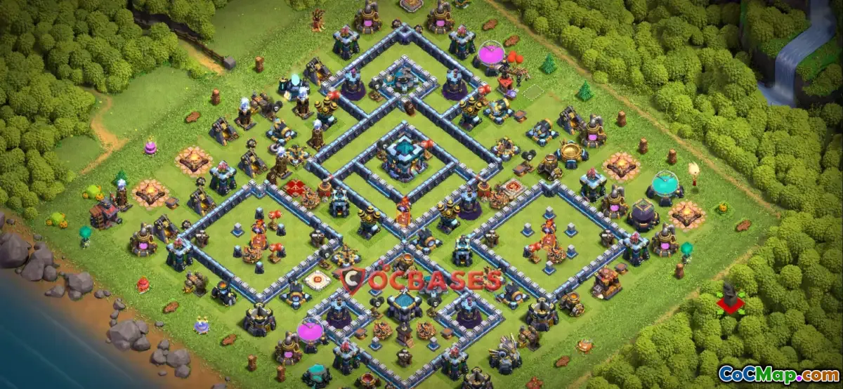 A key feature of the Town Hall 13 trophy base is its symmetry. Many players prefer symmetric bases because they can confuse attackers and make it difficult for them to plan an effective attack path. This symmetrical arrangement helps ensure that defenses are uniformly distributed, making it harder for enemies to exploit weak points in the layout while maintaining a balance across all sides.