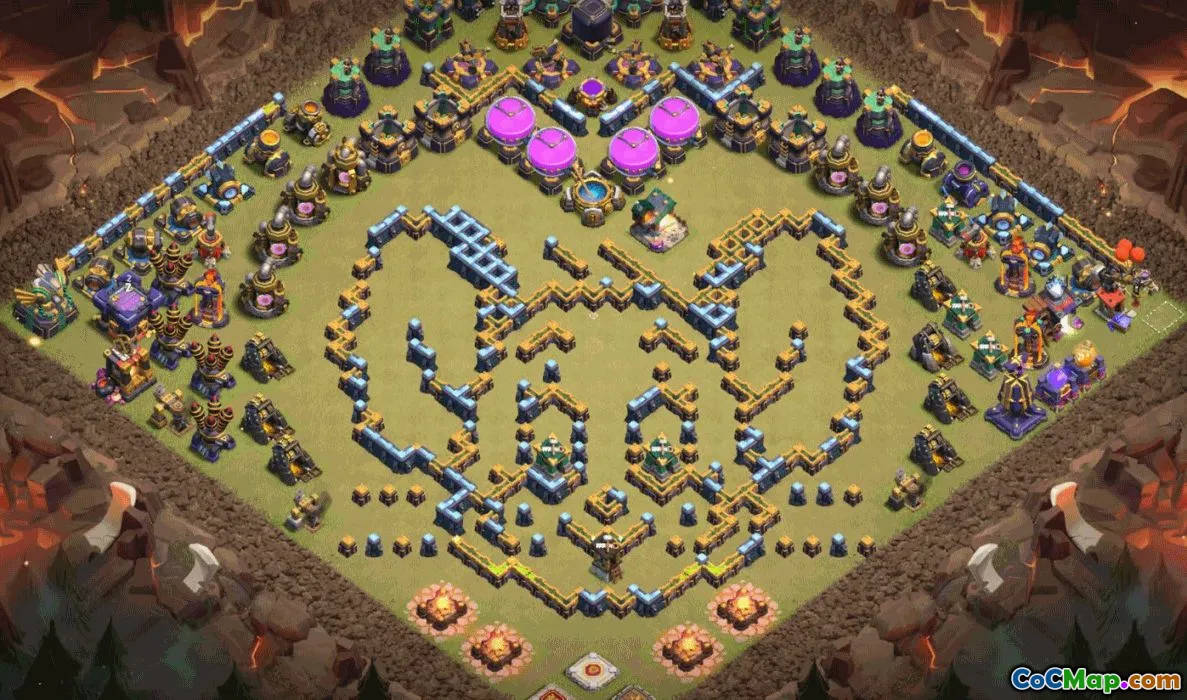 It also doubles as a funny base concept, using playful shapes and visual cues while preserving a robust defense layout for a home village and progression farming. The design supports progress tracking by keeping resource storages protected behind layered walls and traps, allowing you to practice raid routes and upgrade timing without losing map appeal. Copy this base to enjoy a practical, aesthetically pleasing CoC map that combines function with wit.