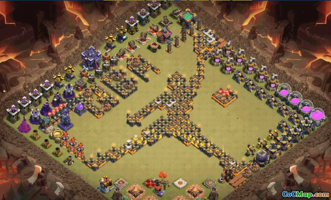 Its core features include a multi-layered core that shelters the Town Hall, balanced storage placement to slow raiders, and well-timed traps to disrupt heavy pushes. Efficient funneling helps units wander into splash damage zones, reducing gains for attackers. The design follows TH15 standards and adapts to common enemy strategies, while maintaining a humorous vibe with playful art elements.