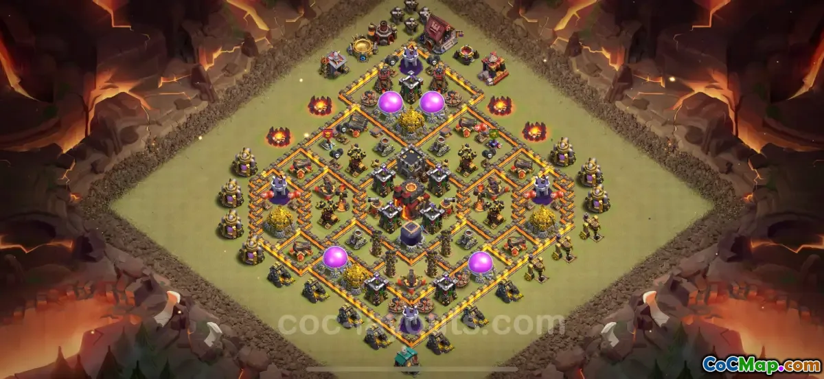 This TH10 base design features a cohesive arrangement of defensive buildings that are strategically placed to cover each other. The layout is intended to minimize vulnerabilities, ensuring that attackers are met with a challenging defense regardless of their approach. The article highlights how the placement of traps, towers, and other defensive structures can create a formidable wall against opponents. These design choices aim to thwart various attack strategies, making it difficult for enemies to predict how to breach the defenses.