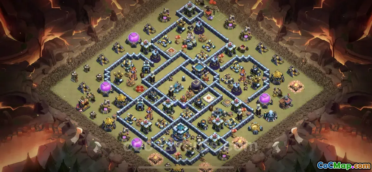 The Best War Base for Town Hall 13 (TH13) is designed to provide robust protection against various attacks in Clash of Clans, especially during Clan War Leagues (CWL). This base layout focuses on creating a defensive structure that can withstand raids from all types of units and strategies. It is crafted to ensure that enemy troops face challenges when trying to reach the Town Hall or key defensive buildings. The layout prioritizes good placement of defenses to maximize coverage and minimize vulnerabilities.