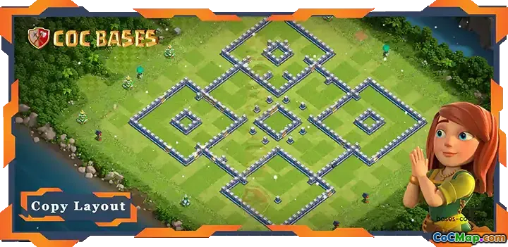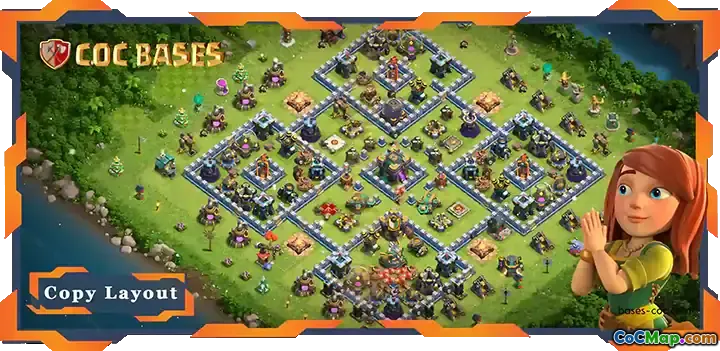 The Anti 2 stars layout aspect of this base design is particularly noteworthy. By effectively dispersing defenses and strategically placing key units, it minimizes the likelihood of opponents achieving a two-star victory. This is an important consideration in high-level gameplay where securing even one star can significantly impact the outcome of a battle and the player’s ranking.
