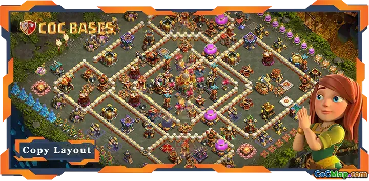 De indeling van de landbouwbasis van Town Hall 16 (TH16) is speciaal ontworpen om je hulpbronnen in Clash of Clans te beschermen. Deze lay-out is specifiek voorzien van een luchtafweer- en anti-driesterrenontwerp, waarbij de nadruk wordt gelegd op de noodzaak om bescherming te bieden tegen krachtige luchtaanvallen en ervoor te zorgen dat aanvallers moeite hebben met het behalen van driesterrenoverwinningen. De strategische plaatsing van verschillende verdedigingsstructuren vergroot de defensieve capaciteiten en effectiviteit bij het afweren van vijandelijke troepen.