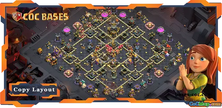 With its anti-everything approach, this layout effectively counters air attacks, ground assaults, and spell strategies, offering comprehensive protection. The well-placed Clan Castles, heroes, and key defenses work together to create a formidable barrier against attacking armies. Access the layout link to implement this effective defense and elevate your Clash of Clans war strategy.