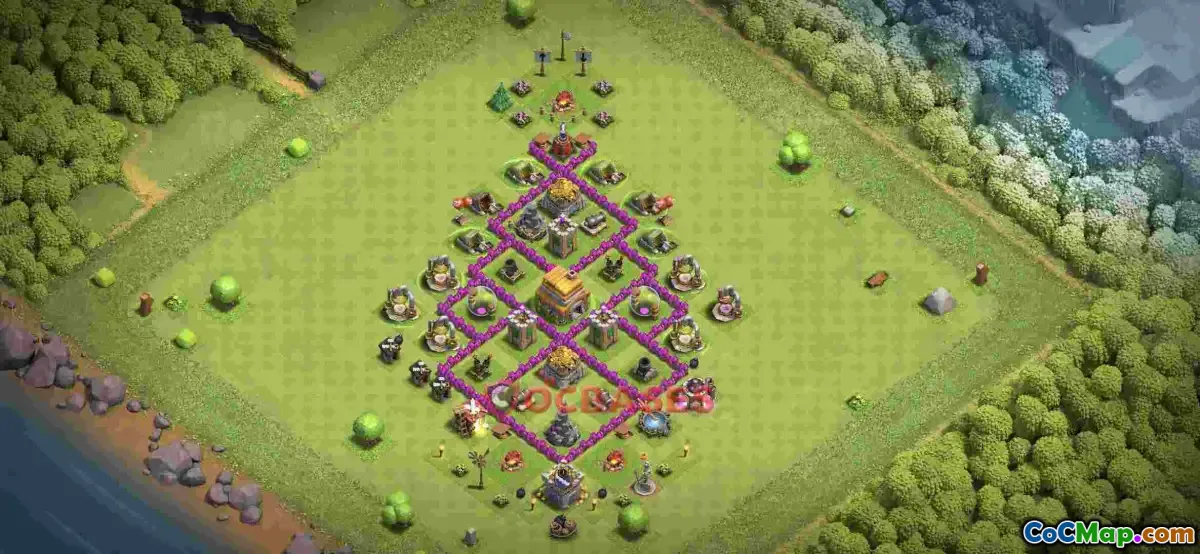Optimize your Town Hall 6 with this anti-2 stars and anti-balloon layout for farming, war, and trophy pushing. Copy the base for best results.
