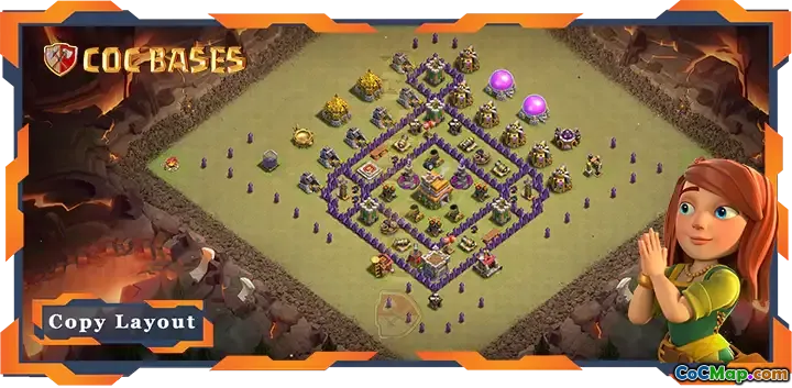 The layout features strategically placed splash damage defenses and centralized air defenses to neutralize air raids effectively. The design also incorporates a robust walls configuration to slow down ground attackers while providing ample space for shelters and traps, enhancing overall survivability. Utilize this layout to secure your clan's win rate and build a resilient defense at Town Hall 7, with a user-friendly link for easy implementation.