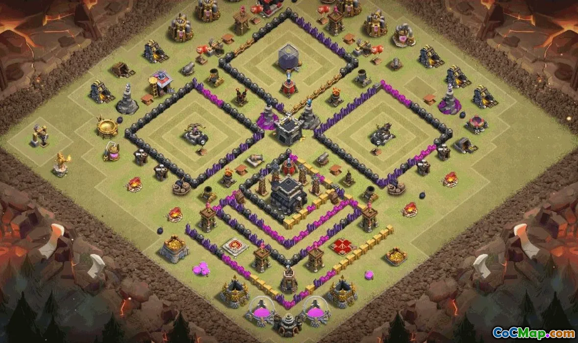 Discover an expertly designed Town Hall 9 base layout that balances offense and defense, perfect for both Trophy pushing and Clan Wars. This layout features strategic placement of defenses, traps, and walls to maximize protection against attackers while providing clear paths for your own units to defend key areas.