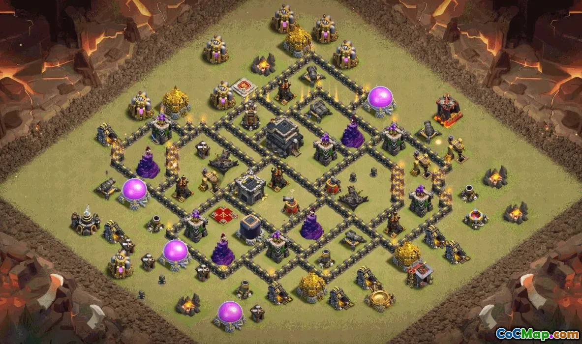 Whether you're upgrading to Town Hall 9 or refining your existing base, selecting the right layout is crucial for defense and resource protection. The provided map layouts include home village, trophy bases, and war bases, all designed with strategic placement of defenses and traps to counter common attack strategies.