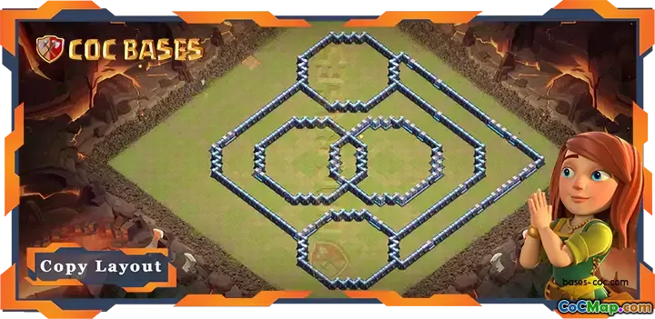 De lay-out is omsloten met muren die een barrière vormen rond de centrale verdedigingsstructuren. Deze muren zijn van cruciaal belang omdat ze vijandelijke troepen naar specifieke paden leiden, waardoor ze kwetsbaar worden voor vallen en geconcentreerd vuur van de verdedigende structuren. Het zorgvuldige ontwerp van de muren helpt de aanvalsstroom onder controle te houden en verhindert een ongecompliceerde benadering van het stadhuis.