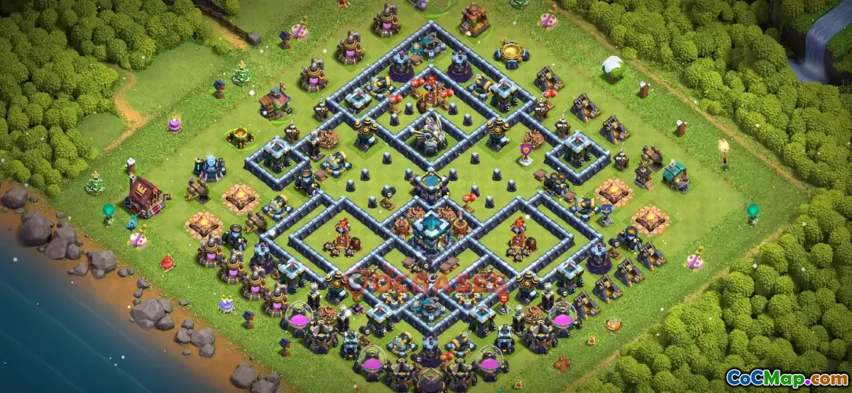 The Town Hall 13 trophy base in Clash of Clans is a strategic layout designed to protect your trophies from attackers. This base layout typically features centralized defenses, such as the Town Hall itself, surrounded by walls and various defensive structures like cannons, archer towers, and air defenses. The purpose of this design is to make it difficult for opponents to reach and destroy the Town Hall, thereby retaining your hard-earned trophies. Properly setting up a Trophy Base at Town Hall 13 can help maintain a stable trophy count while deterring random attacks from players seeking easy wins.