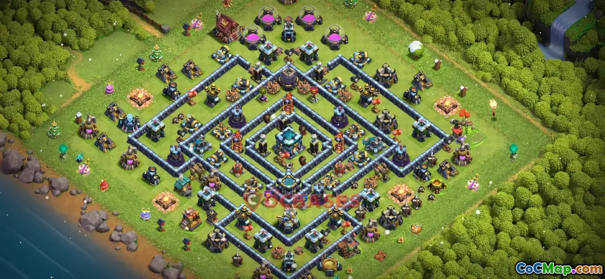 The Town Hall 13 trophy base in Clash of Clans is a strategically designed layout intended to protect a player's trophies from attackers. This base configuration typically features well-thought-out defensive placements, including walls, traps, and defensive buildings like cannons, archer towers, and new Town Hall 13 defenses such as Eagle Artillery and Scattershots. The main goal of this design is to make it difficult for opponents to win attacks and lose trophies, helping players maintain or increase their trophy count.