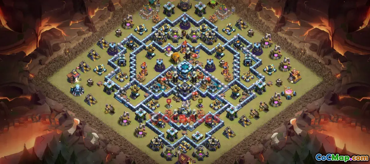 Discover the ultimate Town Hall 13 war base with a diamond layout designed to defend against ground and air attacks. Perfect for Clan War defense. [base link]