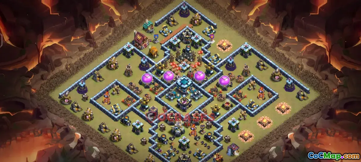 This Town Hall 13 war base is optimized to protect crucial resources and defend against enemy attacks during clan wars. Its strategic placement of defenses, walls, and traps creates a strong perimeter that confuses and thwarts attackers.