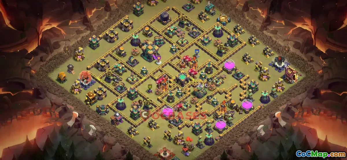 Optimize your Clan War defenses with this expertly designed Town Hall 14 war base layout. The defensive structures are strategically placed to protect crucial resources and prevent attackers from breaching your core. Centralized Inferno Towers and Eagle Artillery provide strong protection against mass attacks, while well-positioned Air Defenses defend against air assaults. The layout aims to create a balanced defense system that confuses and frustrates opponents, making it difficult for them to achieve high destruction percentages.