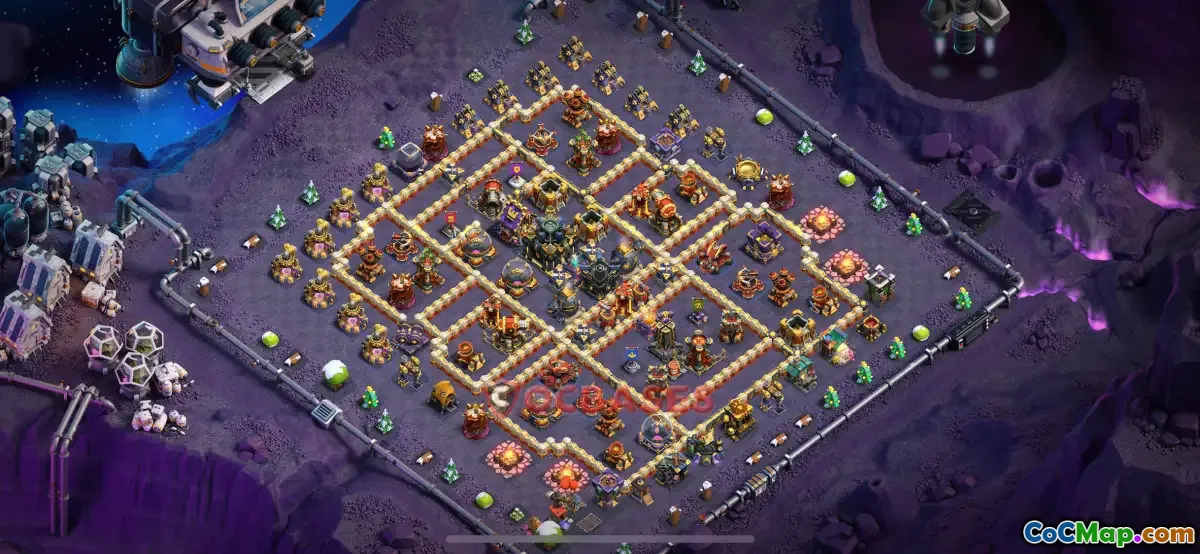 The Town Hall 17 hybrid base in Clash of Clans is designed to blend the strengths of both farming and war layouts, making it versatile and effective in multiple aspects of gameplay. This type of base setup is tailored to protect resources from enemy raids while also being resilient enough to defend against attacking clans during wars. Players often combine strategic placements of walls, traps, and defensive structures to maximize the base's overall defense capabilities.