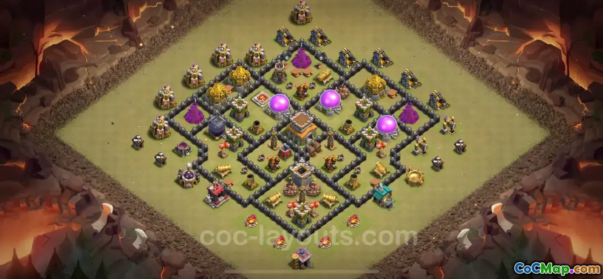 Utformingen av denne basen fokuserer på å skape en befestet kjerne som er utfordrende for angripere å trenge gjennom. Ved å plassere forsvar strategisk og sørge for at nøkkelkomponenter er godt beskyttet, minimerer basen sjansene for at motstandere lykkes med å målrette kritiske strukturer. Denne anti-alt-tilnærmingen tar sikte på å forstyrre angripernes strategier og tvinge dem til kostbare feil, noe som til slutt fører til færre stjerner mot basen.