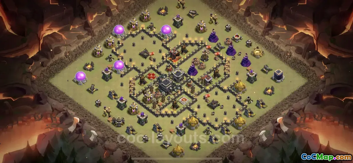 One of the standout features of this TH9 base is its anti-everything setup. The design is meticulously configured to minimize damage from both ground and air assaults, providing comprehensive protection against common threat units. Strong defenses include well-placed archer towers, cannons, and wizard towers that are arranged to cover each other and create a formidable front against enemy troops. Additionally, the layout involves various traps positioned where they can inflict maximum damage, further enhancing the base's defensive capabilities.