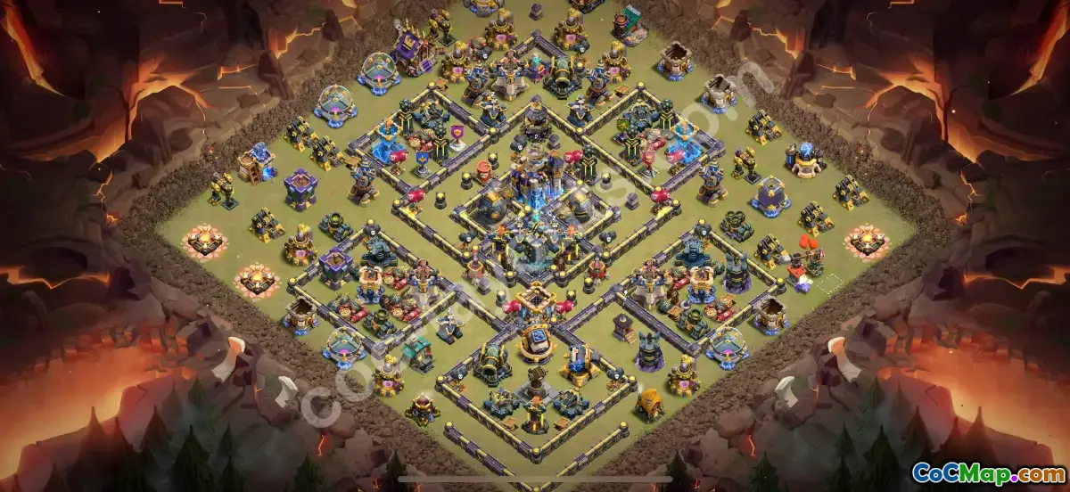Top War TH18 Base with Link offers a well-balanced setup emphasizing core protection for Town Hall 18 and Clan Castle, while also ensuring resource safety. This CWL war base is optimized for 2025, making it an excellent choice for clans aiming for consistent victory and star defense. Each component of this layout is crafted to counter common attack methods, boosting your clan’s war success rate.