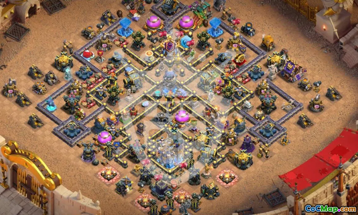 Looking for an effective Town Hall 18 base layout? This design offers a balanced approach to defense, with strategic placement of key structures to protect resources and trophies. Whether you're focused on winning wars or climbing the trophy ranks, this layout is tailored to maximize protection and survivability.