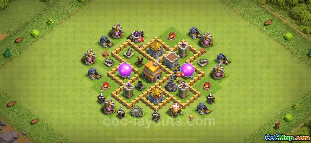 The Town Hall Level 5 (TH5) basedesign i Clash of Clans (COC) er spesielt utviklet for effektivt ressursforsvar gjennom en hybrid layout. Denne designen henvender seg til spillere som søker å beskytte ressursene sine samtidig som den sikrer et robust forsvar mot angrep. Bruk av en hybridbase gir mulighet for en balansert tilnærming, der spillerens ressurser ivaretas effektivt samtidig som de fortsatt kan engasjere seg i jordbruksaktiviteter.