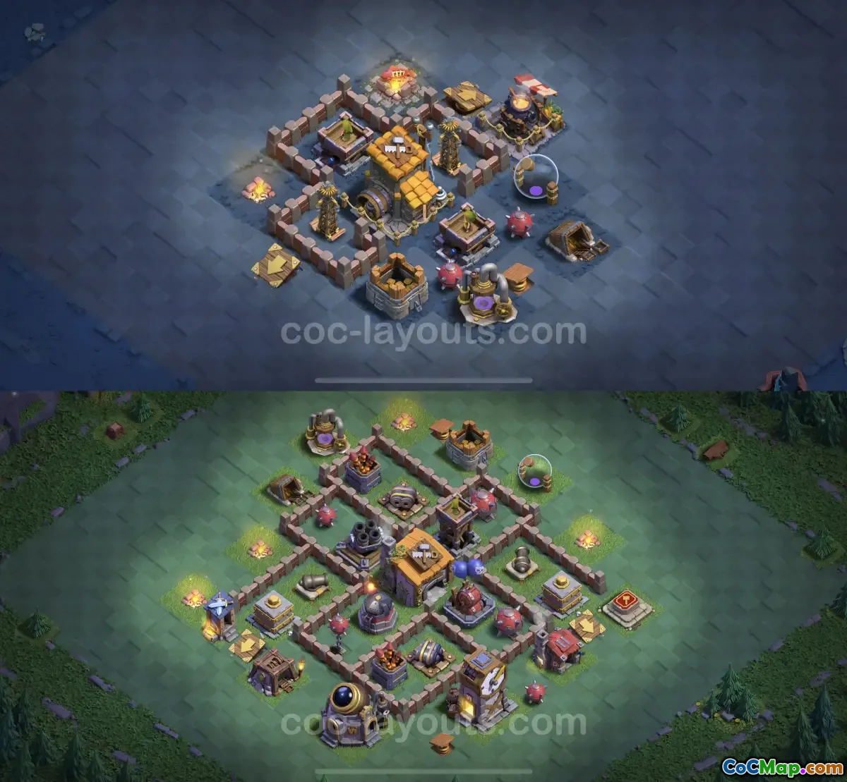 Et sentralt trekk ved BH6-baseoppsettet er det nøye arrangementet av bygninger og feller. Designet prioriterer plassering av høyverdige strukturer, som for eksempel byggmesterhallen, innenfor kjernen av basen. Denne sentrale plasseringen gjør det utfordrende for angripere å nå viktige mål, og dermed forbedre den generelle defensive evnen. I tillegg bidrar inkludering av strategisk plasserte forsvarstårn og feller til å skape choke-poeng, noe som ytterligere kompliserer angrepsstrategien for motstandere. Denne taktiske ordningen sikrer at spillere kan minimere skaden påført av fiendtlige tropper.